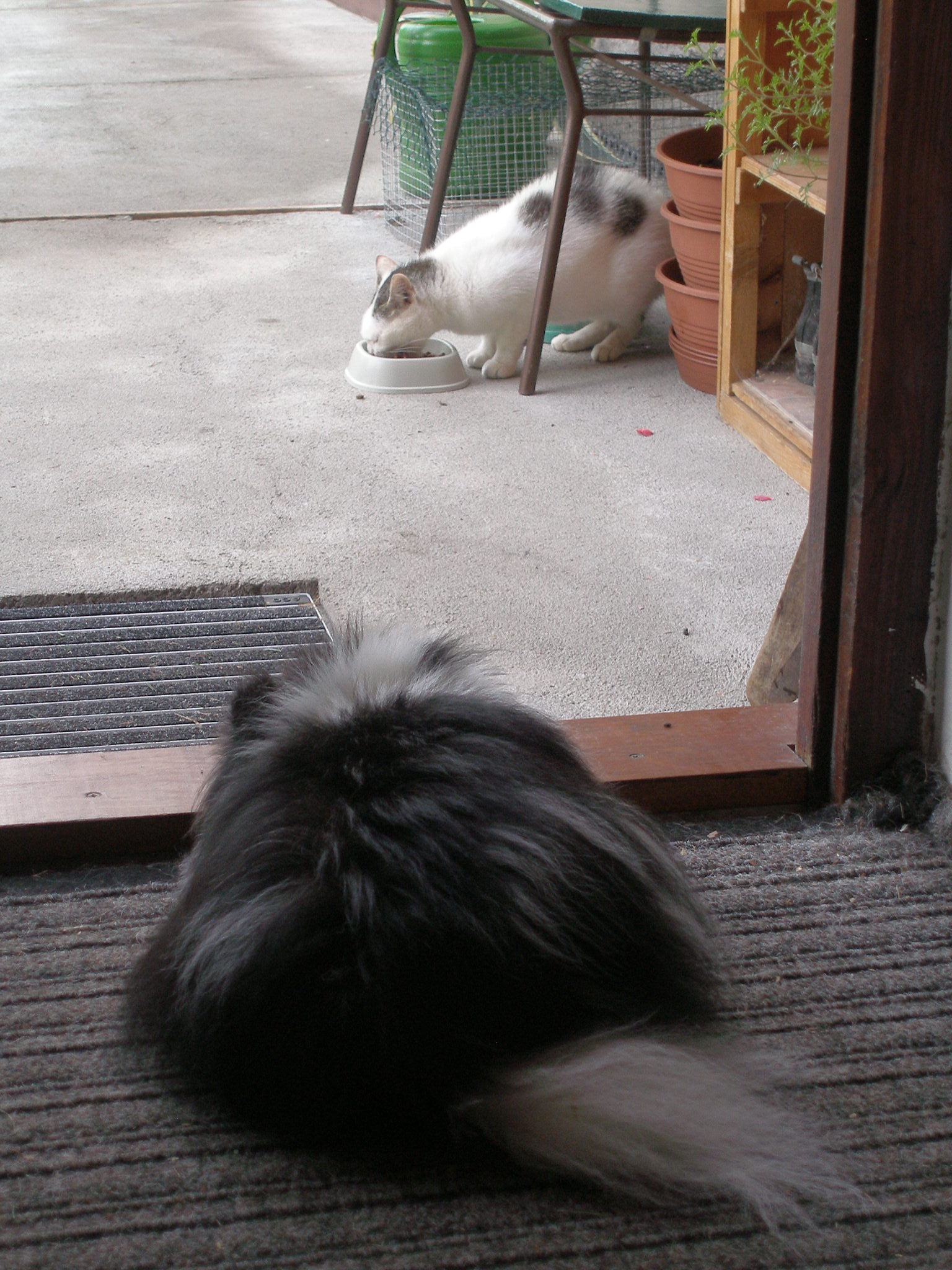 Chalupa , zahrady a vesnice nabízí ohromný prostor, jak se mohou kočky nepotkat. Micinka předvedla, že není žádná vtěrka, ale také to, že si nenechá všechno líbit. Evidentně by se ráda s domácí kočičí partou spřátelila, ale jako rozumná číča tomu nechává čas. V případě ojedinělého útoku jsme byli svědky, že se nedá (a Lucka to hned pochopila).